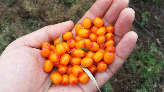 Talking about perfect timing, it was also harvest season for sea buckthorn! It was my first time to see the said plant since I was born in a tropical climate, and berries are not really grown in our place (well papel except for strawberries because we have it in Baguio). Buckthorn is a common term for shrub or small tree. And there are about 150 species of buckthorns. Sea buckthorn is also referred to as seaberry, sallowthorn or sandthorn. I did a little research over here and found out that sea buckthorn has so many health benefits (for health-conscious people reading this: here, here). According to webMD, the fruit is used for improving eyesight and slowing the aging process while the leaves and flowers are used for treating arthritis, gastrointestinal problems, gout and skin rashes. A tea containing sea buckthorn leaves is used as a source of vitamins, antioxidants and other minerals for improving blood pressure and lowering cholesterol and boosting immunity. The plant has so many thorns, making it difficult for us to harvest. The smell is not as good as I was expecting, and it tastes sour. But when I am thinking of all the good health benefits this fruit can offer, it's all worth it. Truly, we shouldn't prejudge the worth and value of something by it's appearance (and smell) alone.